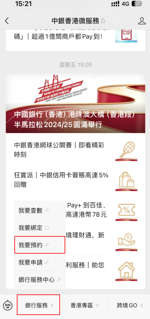 找到中银香港微服务公众号,点击银行服务,选择我要预约,最多提前7天预约。