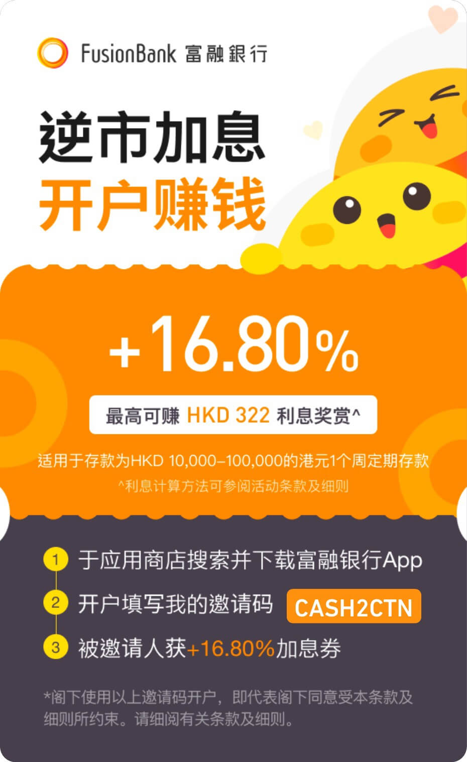 | 富融银行 | ✅ | CASH2CTN | 定存利率不错,新用户走邀请可拿16.8%定期加息券,无实体卡 | https://www.fusionbank.com/ |