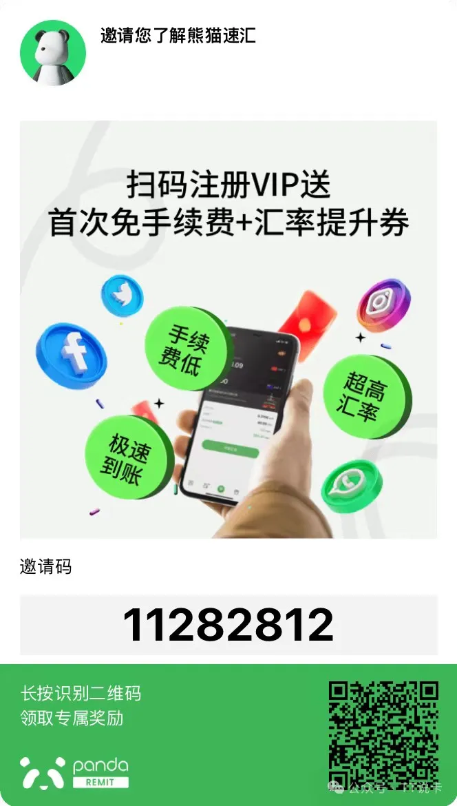 扫描下方👇二维码注册熊猫速汇,即可获得免手续费+VIP钻石汇率提升卡,同时也能享受客户经理专人服务。